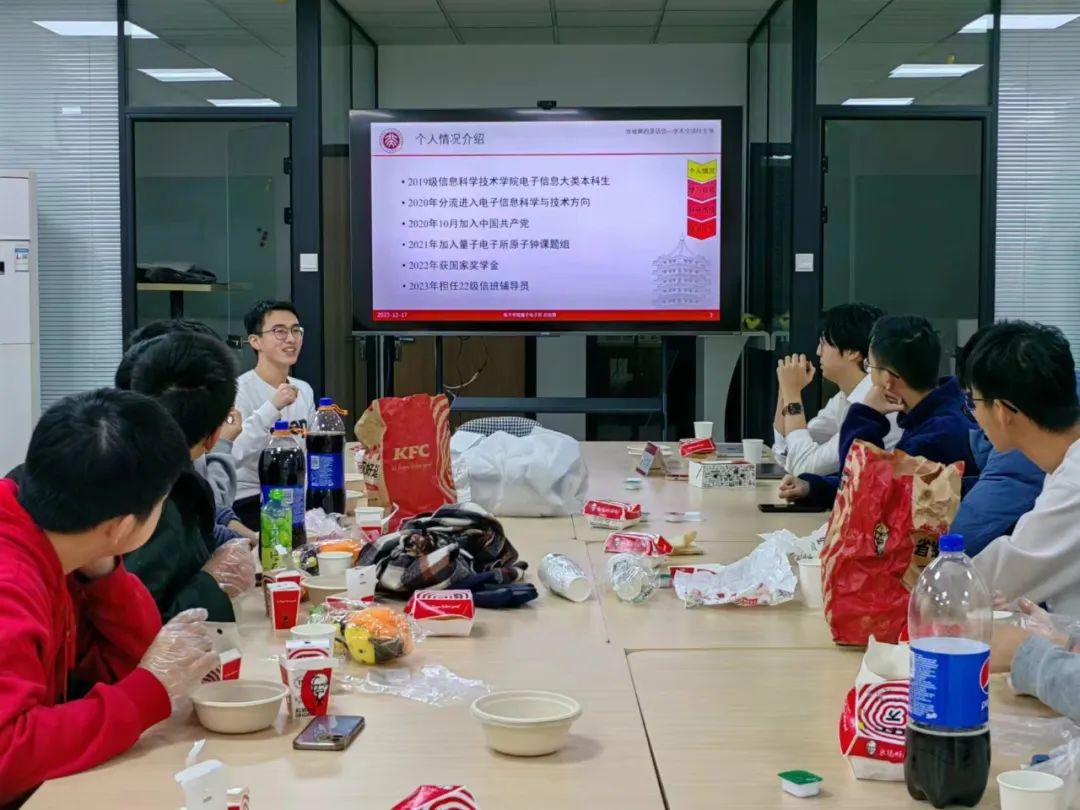 2023年12月17日中午,“攻城狮的茶话会—学术交流EE专场活动”于理科一号楼1127学生活动室成功举办。2023级电子信息科学(量子电子学)直博生、国家奖学金获得者、2022级信班辅导员吕杭哲同学,2020级应用物理学专业本科生、国家奖学金获得者俞江瑞同学受邀与15名信科学院低年级同学共同参与本次活动。AV研究所