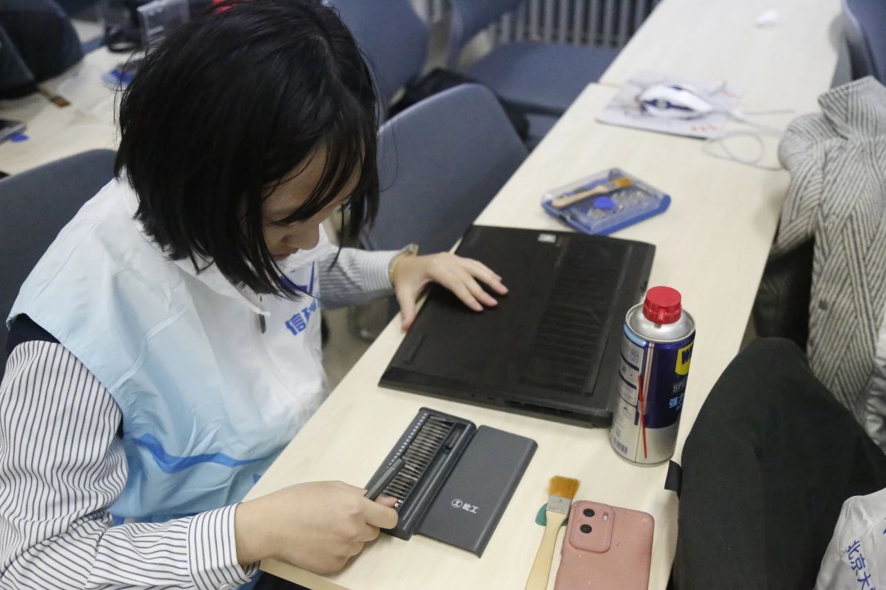 志愿者们身着统一的信科青协志愿者服装,热火朝天地行动起来。同学们扫码签到后,志愿者通过小程序浏览问题,有序接单,拿取螺丝刀、酒精棉片等物资并开展维修。