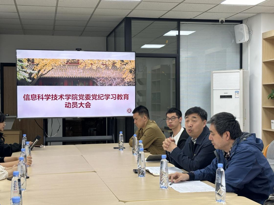 在理科一号楼1127学生活动室召开学生党支部党纪学习教育部署动员会。学院党纪学习教育工作组组长、党委书记严敏杰出席会议。院党纪学习教育工作组成员党政办公室主任杨琦、教工行政党支部书记宋今和团委书记吕媛,以及各学生党支部书记和部分支部委员共同参会。会议由院党纪学习教育工作组副组长、副院长邓斌主持。