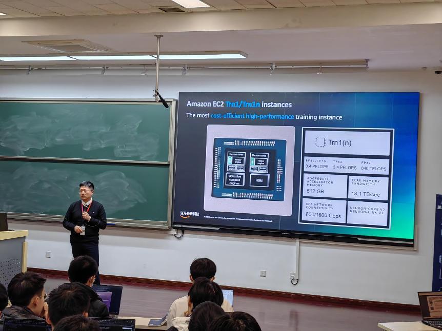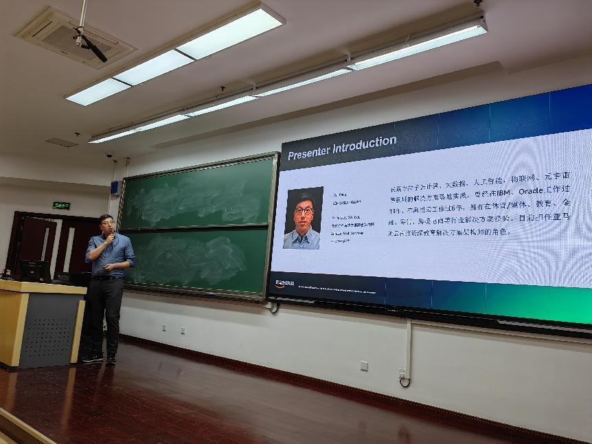 理科教学楼208教室顺利举办。曾任中科院物理研究所副研究员,现任亚马逊云科技高等教育行业总监的刘东屏教授和亚马逊云科技资深解决方案架构师石锋老师受邀进行了以“亚马逊云科技生成式人工智能(GenAI)助力云端科研”为主题的分享,400余名师生到场聆听;AV研究所