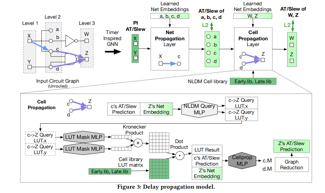 除了芯片静态时序分析领域,他还积极探索EDA和人工智能的交叉方向。在研究中,他将图神经网络和时序分析引擎相结合,提出跨越芯片设计流程多个环节的建模技术,定制图学习方法模拟时序分析的解析过程。同时他还探索将时序分析过程与神经网络训练进行类比,提出了学术界首个基于可微时序引擎的布局优化算法,较当前最先进的布局算法性能提升28%以上。