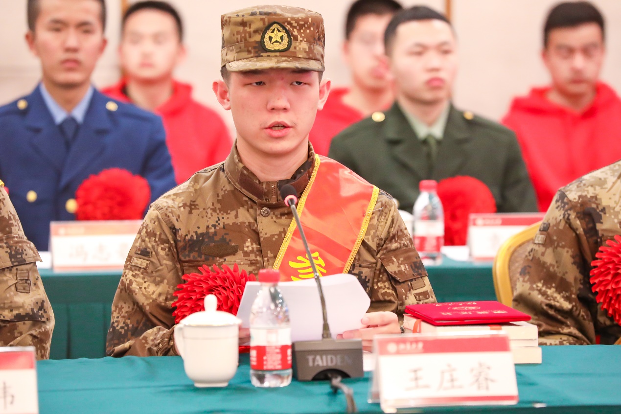 药学院2018级本科生邹振洋代表刚刚退役返校的老兵发言,他讲述了自己所在功勋舰艇部队荣誉背后的默默坚守,也表达了在平凡的岗位“立志做一颗有北大风格的螺丝钉”的心声。邹振洋对服役期间学校领导、老师的关怀表示感谢,并激励即将踏入军营的新兵同志们不负青春、勇往直前,为国防和军队建设亮出北大青年最闪亮的名片。
