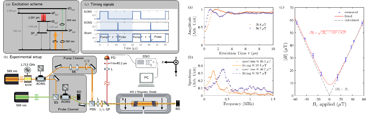 电子学系量子信息技术团队与德国亥姆霍兹研究所等科研机构合作提出了基于钠原子无反射镜激光进行远程磁场测量的新方法,并在地磁场范围中实现了基于钠原子定向光辐射的远程标量磁测量,这是国际上该类型原子光散射远程磁探测的首次实验实现。
