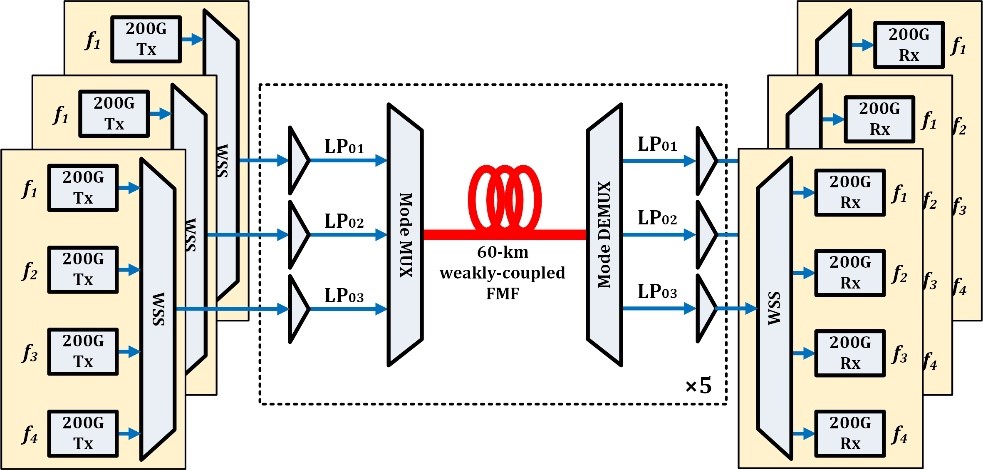 电子学系区域光纤通信网与新型光通信系统国家重点实验室联合中国移动、华为、长飞,共同实现了全球首个基于弱耦合少模光纤的骨干网高速实时传输原型系统验证,实现了总长度为300km的3模式×4波长×200Gb/s弱耦合模分复用传输实验,快速推动了面向未来的基于多维复用的超大容量光传输技术的研究进步。