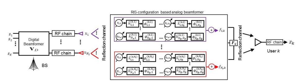 图3 (a)可重构超表面多用户下行通信(b)可重构超表面混合波束成形传输方案