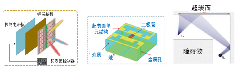 图1 a)超表面整体结构;b)超表面单元结构;c)超表面调控电磁波反射方向;d)可重构超表面后5G通信场景