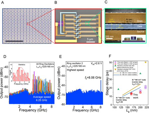 碳基电子学研究中心、纳米器件物理与化学教育部重点实验室张志勇教授-彭练矛教授课题组发展全新的提纯和自组装方法,制备高密度高纯半导体阵列碳纳米管材料,并在此基础上首次实现了性能超越同等栅长硅基CMOS技术的晶体管和电路,展现出碳管电子学的优势。该课题组采用多次聚合物分散和提纯技术得到超高纯度碳管溶液,并结合维度限制自排列法,在4英寸基底上制备出密度为120 /μm、半导体纯度高达99.99995%、直径分布在1.45±0.23 nm的碳管阵列(见图二),从而达到超大规模碳管集成电路的需求。基于这种材料,批量制备出场效应晶体管和环形振荡器电路,100 nm栅长碳管晶体管的峰值跨导和饱和电流分别达到0.9 mS/μm和1.3 mA/μm(VDD=1 V,见图3),室温下亚阈值摆幅为90 mV/DEC;批量制备出五阶环形振荡器电路,成品率超过50%,最高振荡频率8.06 GHz远超已发表的基于纳米材料的电路(见图4),且超越相似尺寸的硅基CMOS器件和电路。