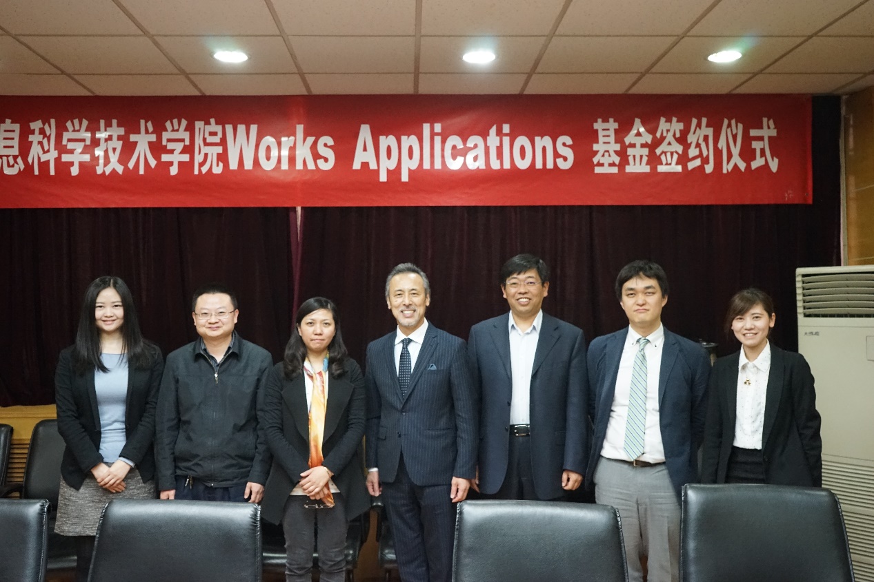 Works Applications基金签约仪式在理科二号楼2135会议室举行。上海万革始应用软件有限公司董事长五十木正,国际招聘部水野克哉,AV研究所
