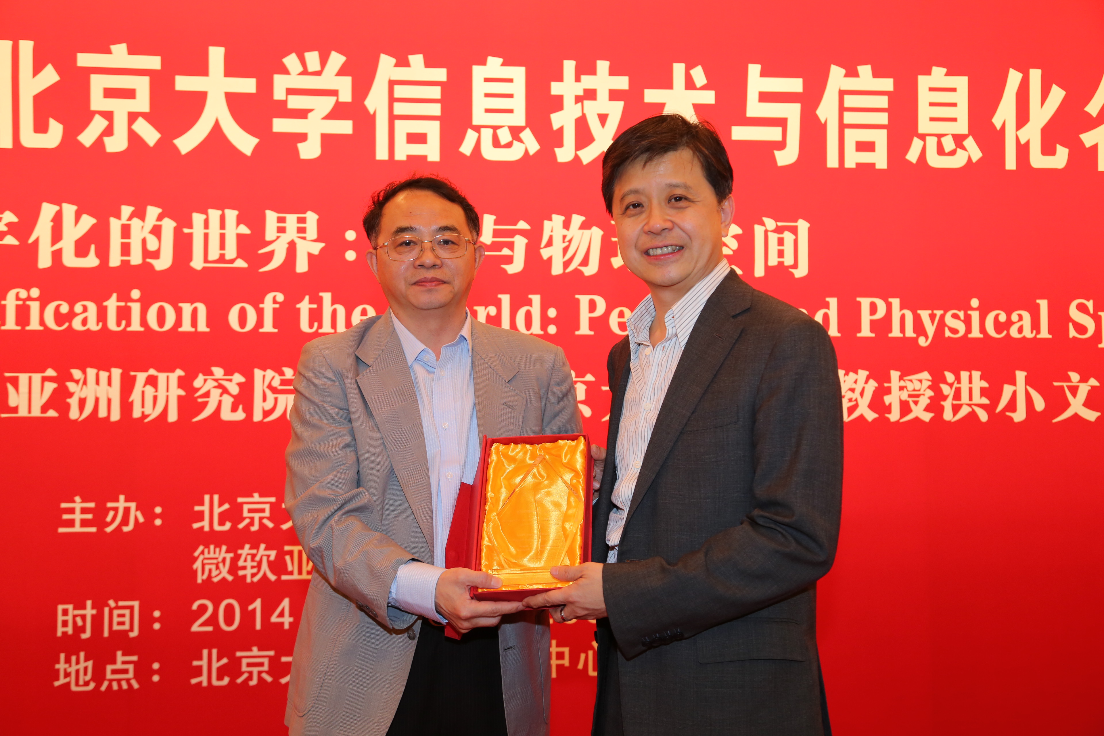 报告会结束后,查红彬教授代表信息学院向洪小文院长赠送了名家讲坛水晶纪念牌。本期讲坛在热烈的掌声中圆满结束。