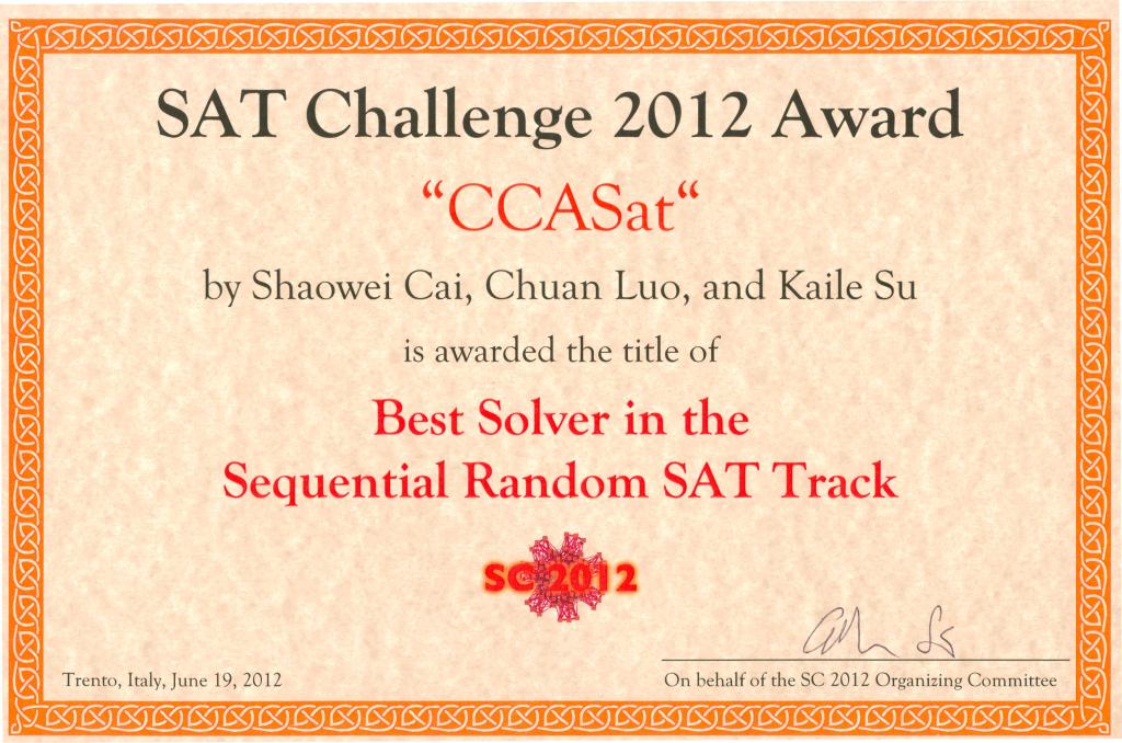 软件研究所苏开乐教授指导的博士生蔡少伟等人设计的求解器CCASat在随机组给出的600道挑战性难题解出了其中的70.5%,夺得该组第一名。这是亚洲国家和地区在SAT会议主办的可满足性问题求解系列比赛中所取得的首个冠军。