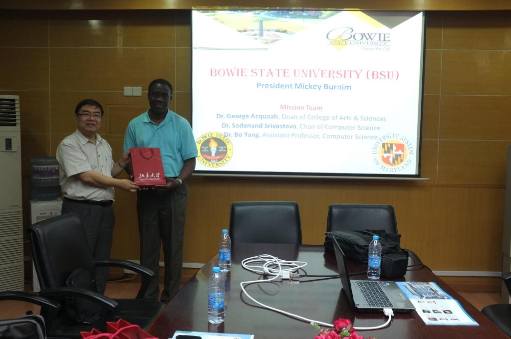 随后,Bo Yang博士介绍了鲍威州立大学的历史延革,计算机系的主要研究方向、主要研究成果,以及短期访问、长期交换、双学位等项目的设置。Acquaah院长表示欢迎更多的北大学生前去交流。