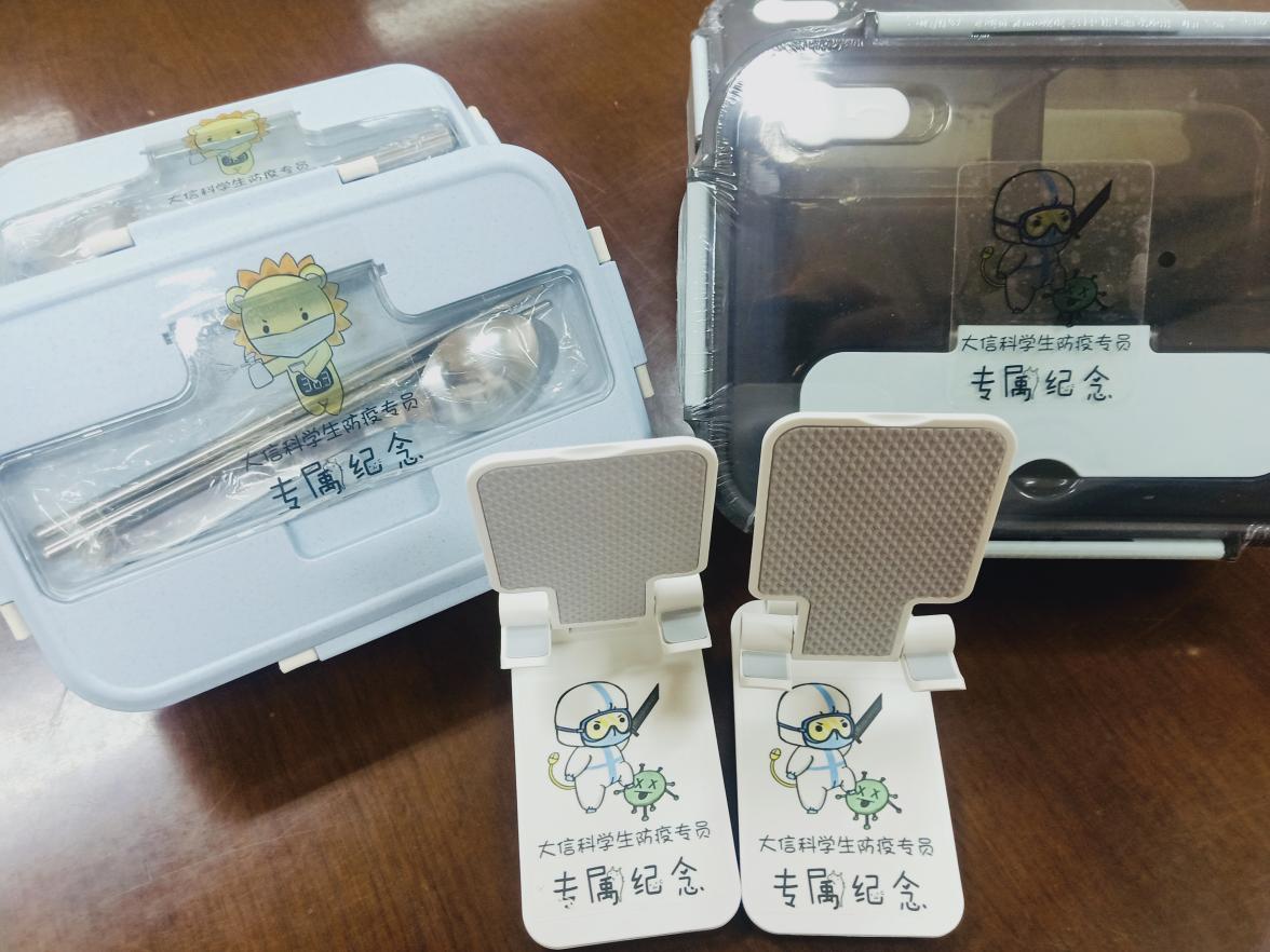 现场还为学生防疫专员赠送了定制纪念品。手机支架承载着学院对专员们工作的期许:“支”意为希望专员们共同“支起同心抗疫的屏障”;“架”意为希望专员们“架起师生沟通的桥梁”。环保餐盒既呼应了学院鼓励大家自带餐盒食堂购餐的倡议,也传达了“绿色抗疫、点滴做起”的理念。