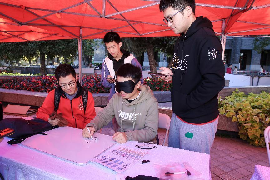 环绕场地一周的是10余个融合了信科特色文化的互动体验活动展位。大家可以在“愤怒的程序员”展位,亲手击倒各种程序漏洞,体验制胜的成就感;在“二进制颠球”展位,体验二进制编码和体育运动的奇妙结合;在“蒙眼艺术家”展位,与伙伴们合作闯关,感受团队合作的乐趣和并肩作战的默契。
