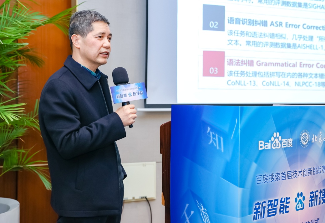 王厚峰教授作了“生成框架下的文本纠错”主题演讲。他介绍了句子结构、用词、标点、拼写以及语境等语法纠错在自然语言处理中的发展历程、技术前沿、行业应用以及北大团队取得的成就,获得与会专家学者的一致好评。
