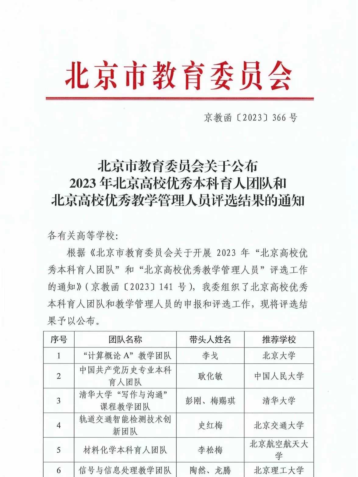 “计算概论A”教学团队获评2023年“北京高校优秀本科育人团队”。
