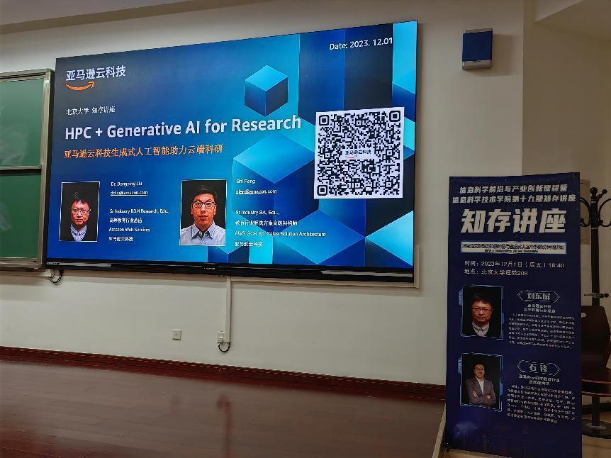 理科教学楼208教室顺利举办。曾任中科院物理研究所副研究员,现任亚马逊云科技高等教育行业总监的刘东屏教授和亚马逊云科技资深解决方案架构师石锋老师受邀进行了以“亚马逊云科技生成式人工智能(GenAI)助力云端科研”为主题的分享,400余名师生到场聆听;AV研究所