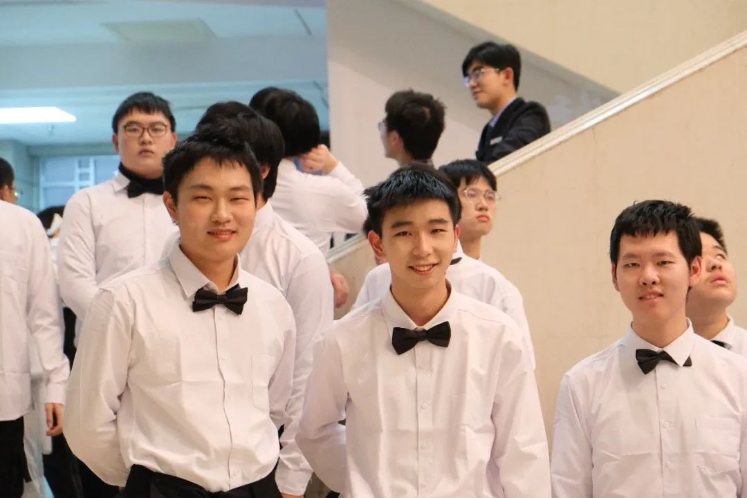 换上演出的西装和礼服,大伙陆续赶到集合的教室,准备妆造。尽管信科代表队人数众多,化妆任务量很大,大家仍然耐心地排着队,志愿者们也满负荷地工作着,从底妆到眼影、腮红、口红,完成上台前的华丽“变身”。志愿者们既专业又尽责,很多人到后来累得不得不坐着化妆,真的辛苦她们了!而负责组织的同学各处协调进度,尽力让人数庞大的化妆任务按时完成。大家齐心协力、紧锣密鼓地准备着,氛围中虽有急迫和压力,却也不曾淹没了轻松和笑容。当一位同学化妆的时候,自然少不了已经被围观过的和将要被围观的同学在一旁围观,大家互相评论着各自的妆容,些许缓解了上场之前的紧张。