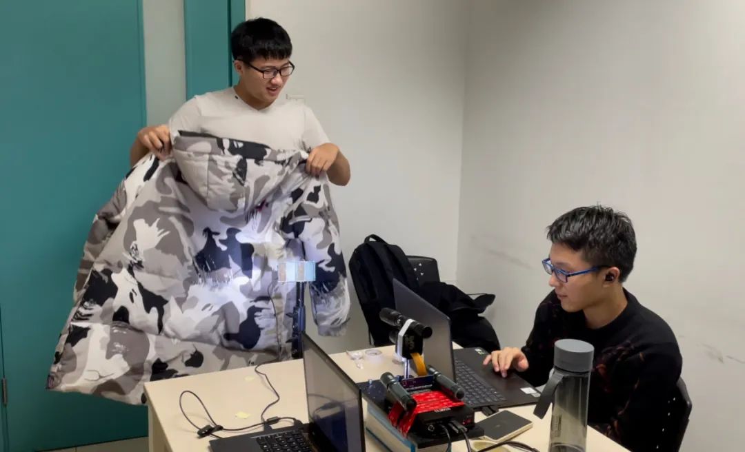 周可行(左)正在测试环境光对基于脉冲相机的可见光反射通信的影响