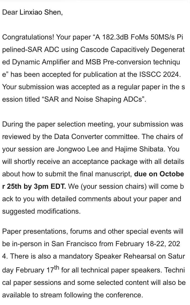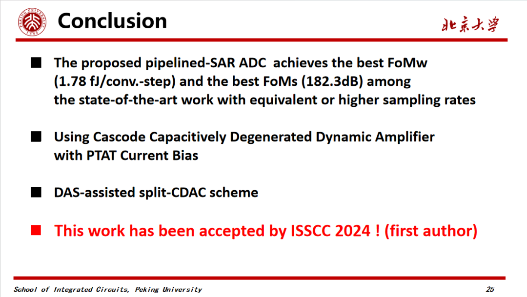 2020级本科生陈卓毅作为第一作者的论文A 182.3dB FoMs 50MS/s Pipelined-SAR ADC using Cascode Capacitively Degenerated Dynamic Amplifier and MSB Pre-Conversion Technique(《一个182.3dB FoMs的使用了容性源极负反馈的共源共栅动态放大器和最高位提前转换技术的流水线-逐次逼近型模数转换器》)被录用,论文的通讯作者是集成电路学院的沈林晓老师和叶乐老师。