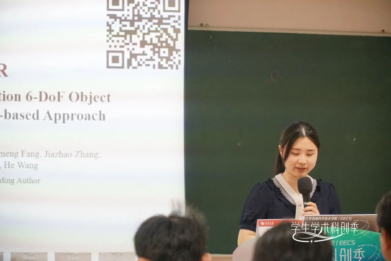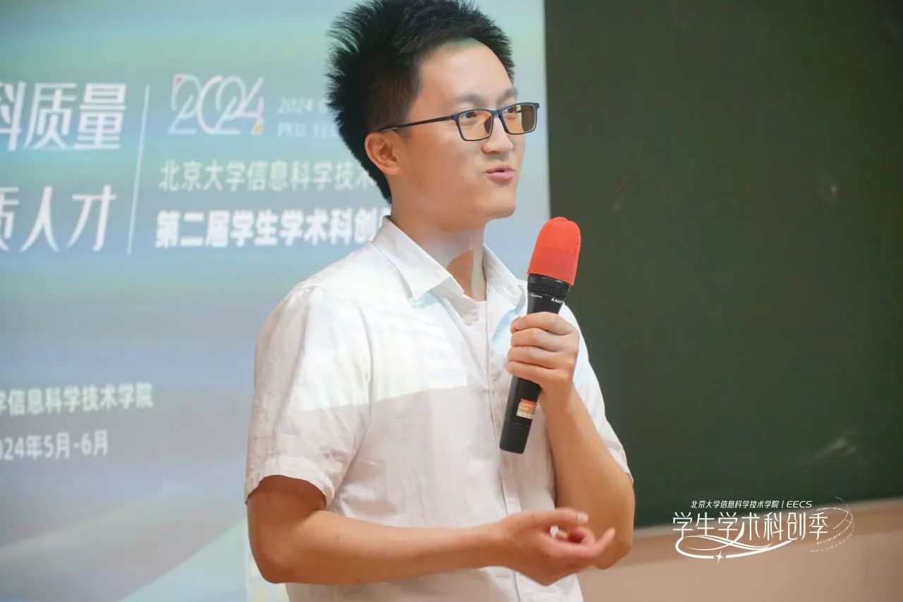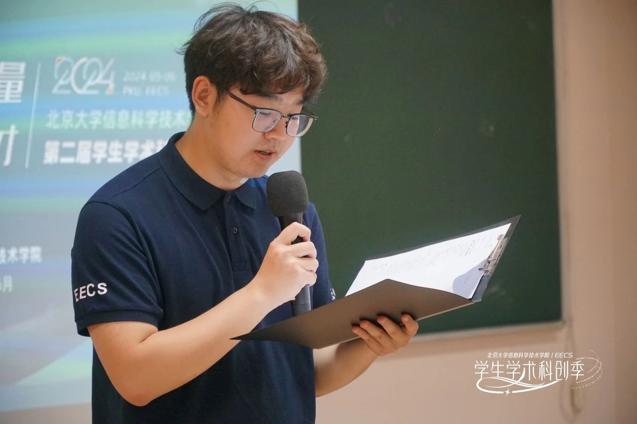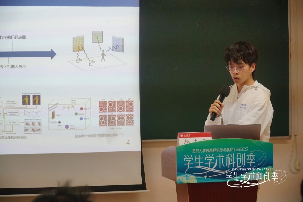 在亮点报告环节中,同学们用简洁明了的语言,介绍了自己的科研项目和成果。同学们的研究领域涉及普通微控制器上实现内存高效的语言模型推理、滚动混合比特脉冲模式重建高帧率高动态范围视频、基于超大规模可重构超表面的近远场混合雷达技术研究等。同学们利用图表和实验数据,生动而具体地展示了自己的研究成果,让现场观众对信科学院本科生科研成果有了更深入的了解和认识。