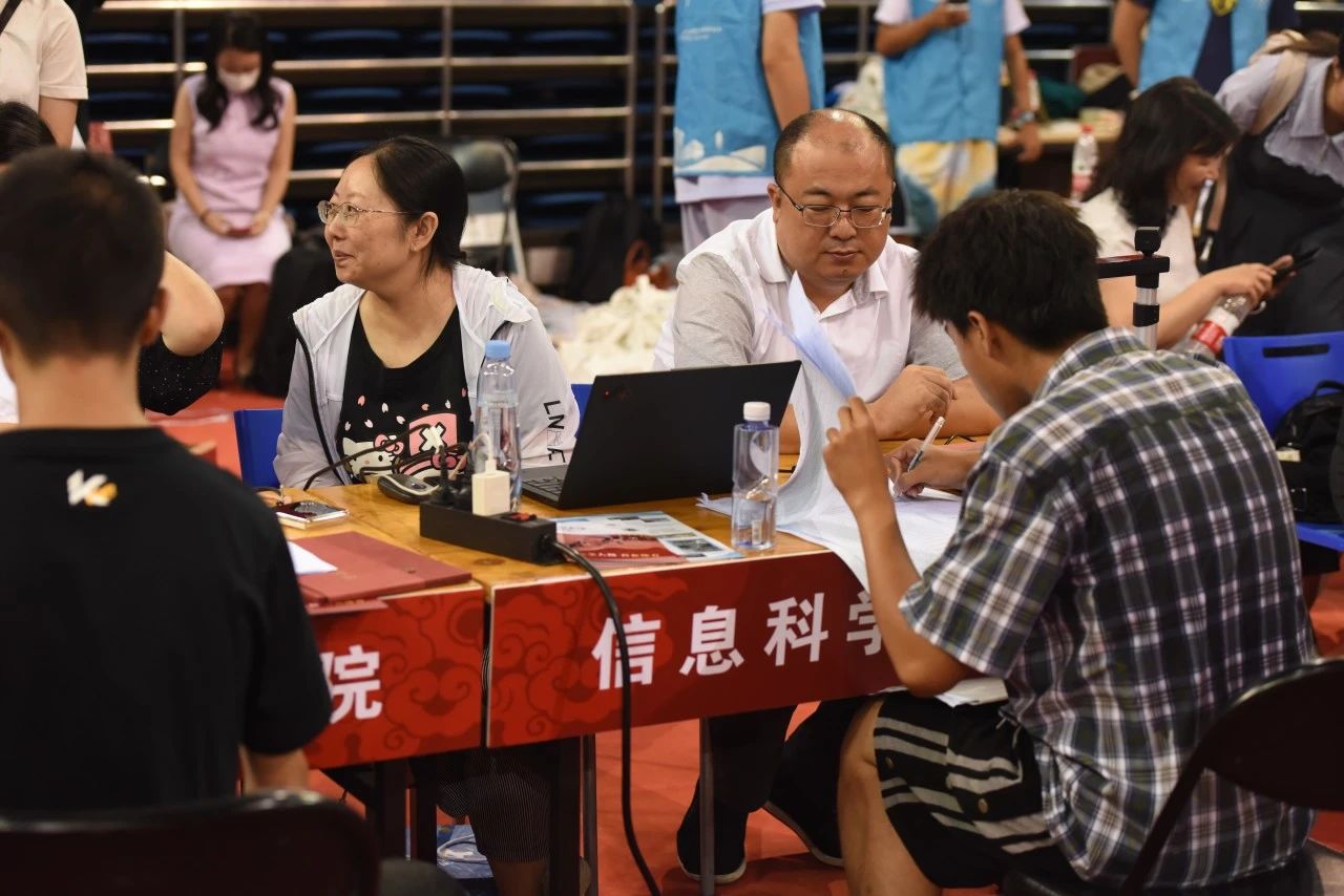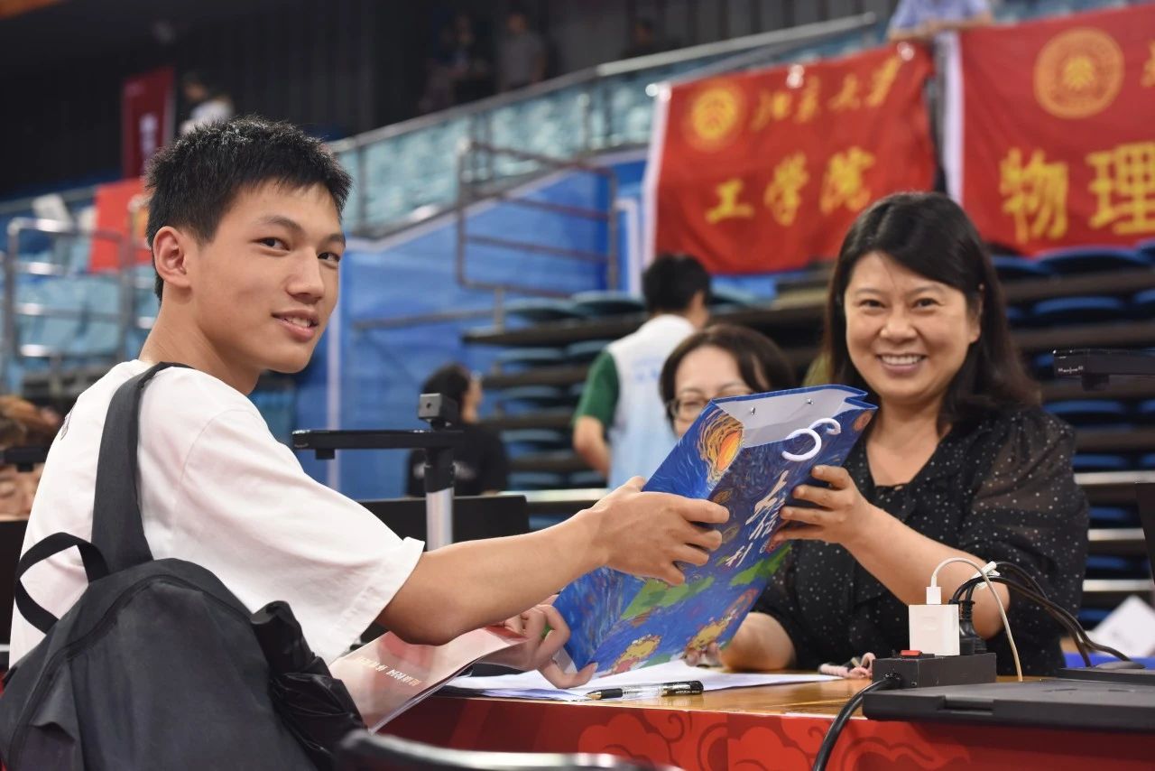 随着越来越多的新同学走进邱德拔,迎新会场也热闹了起来。学院老师带领志愿者们高效地进行核对材料、录入信息、分发材料等各项工作,并为新生送上学院精心准备的礼物。学院领导们也与同学们亲切交流,关心大家的报道情况。志愿者们热情的笑容让新同学少了一丝局促,老师们也亲切耐心地为他们解答疑惑。