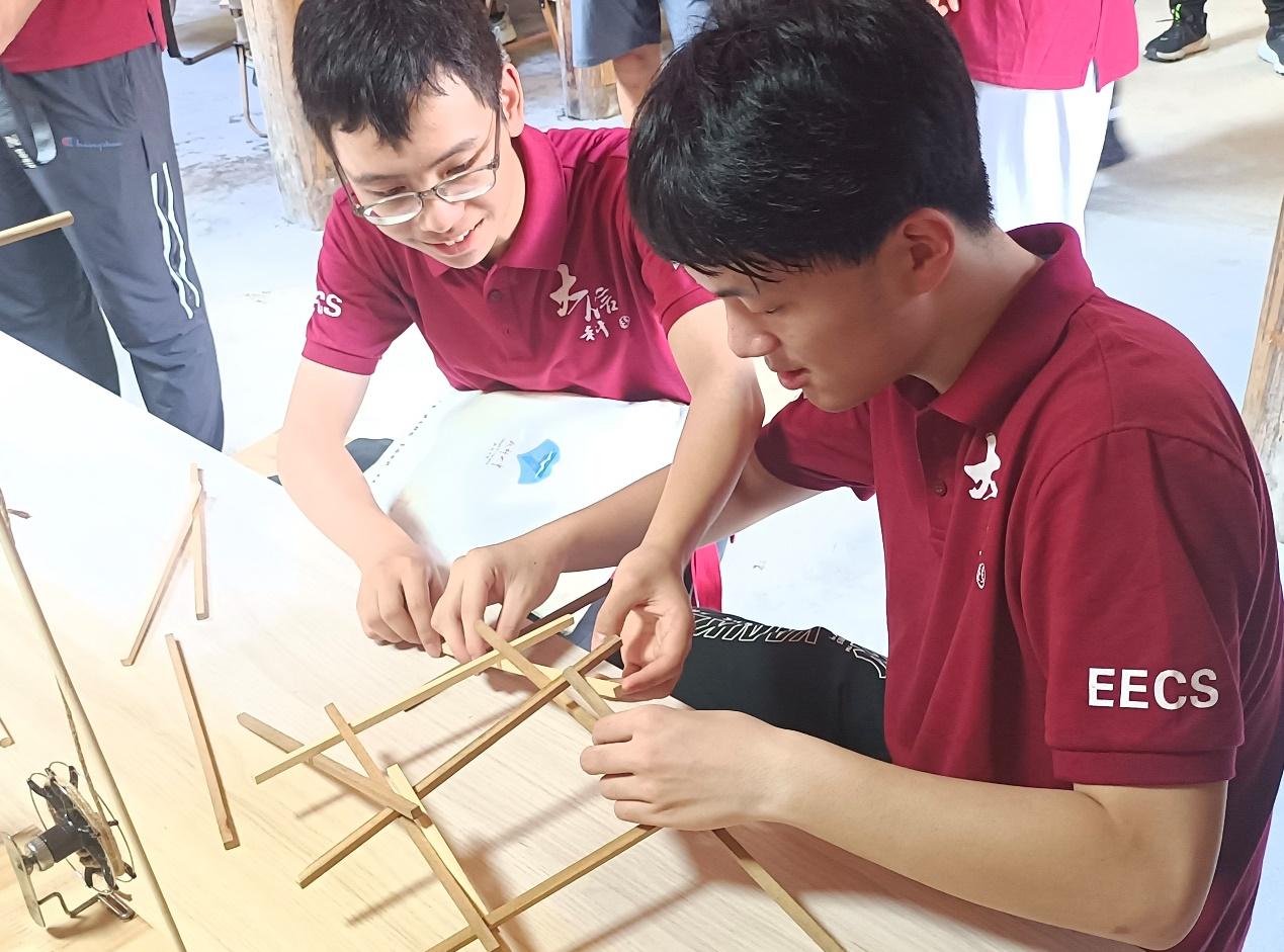 随后,实践团在村内参观了当地的新业态,亲身感受了下党村蓬勃发展的兴盛景象。实践团参访了油画院、乌金陶传习所、廊桥技艺展览馆、闽浙台民族文化交流馆等各具特色的场所,深入领略了当地的文化传统与风土人情。其中廊桥技艺展览馆无疑给很多同学留下了深刻的印象,在初步了解了廊桥的构造原理与搭建方式后,同学们获得了亲手实践用小木棒搭建廊桥模型的机会,参照馆内展示的成品,同学们纷纷动手搭建出了自己心目中的廊桥,在这个过程中既体会到了廊桥建造的复杂与精妙,也感受到了古代工匠的智慧与创造力。
