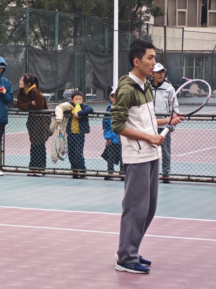 郑睿扬在网前准备截击,后面的小朋友聚精会神地观战