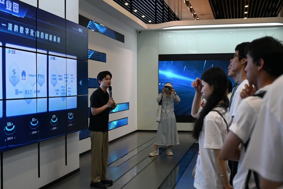 随后,调查团来到了路桥区数字经济产业园,并重点调研了其中的十沣工业元宇宙中心和华为(台州)数字技术创新基地。园区聚焦赋能传统产业转型升级,着力孵化培育工业互联网、车联网、物联网、人工智能等新经济产业,是路桥加速“产数融合”的核心载体。通过数个生动具体的智能化赋能生产的例子,同学们对数字科技赋能传统经济又了深切的体会。