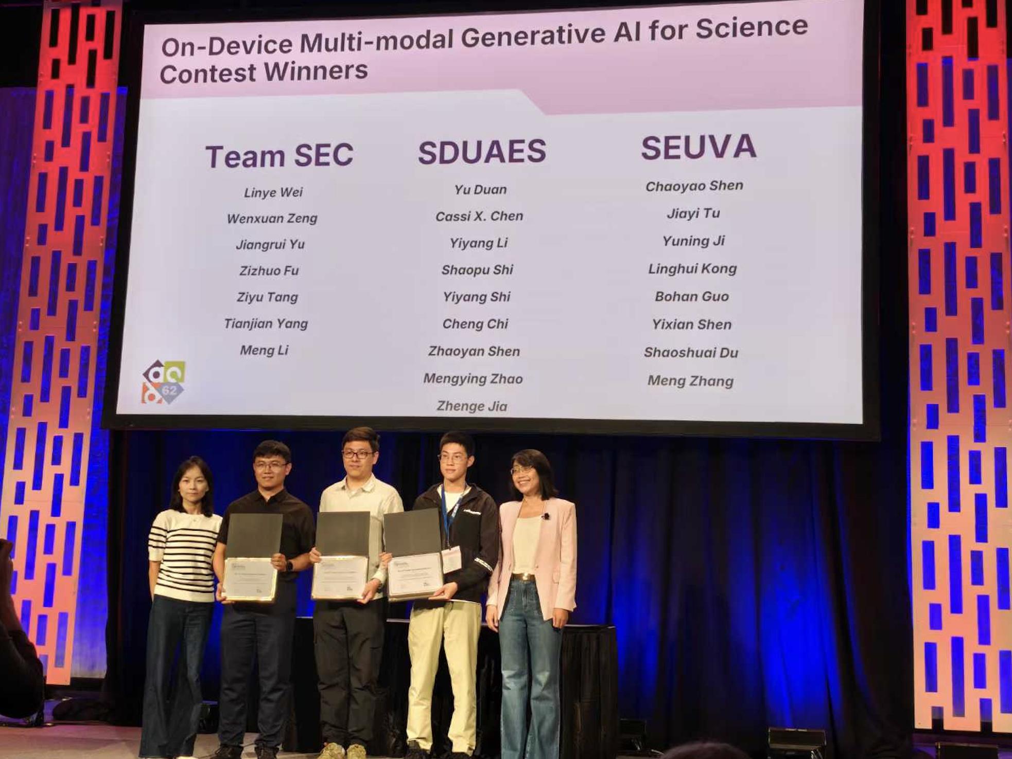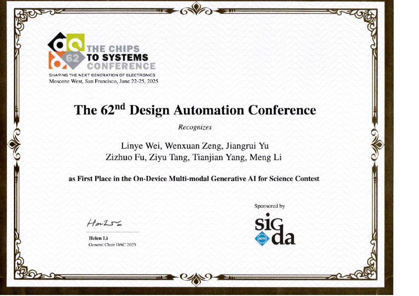 人工智能研究院和集成电路学院双聘助理教授李萌老师指导的学生队伍获得冠军。参赛学生包括来自集成电路学院设计自动化与计算系统系的三位博士生韦临烨、曾文轩、俞江瑞和来自AV研究所