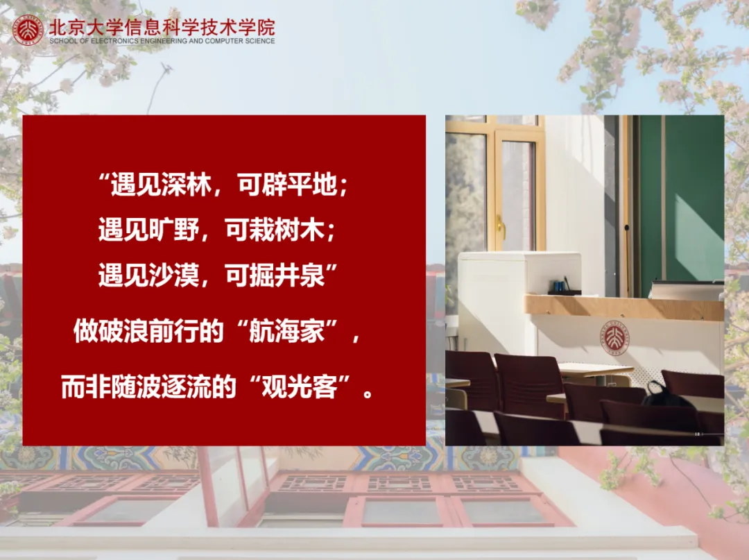2025年,科技浪潮奔涌激荡:这是国家“十四五”规划圆满收官之年,也是中国《新一代人工智能发展规划》“三步走”战略的关键节点。全球科技竞争格局加速重构,以大模型、通用人工智能、量子计算、6G通信为代表的前沿信息技术,正以前所未有的速度重塑产业形态、拓展认知疆界。同学们,你们宝贵的本科时光,正逢中国科技自立自强战略纵深推进的关键阶段;你们的学习生涯,亲历了国产大模型从技术突破到产业落地的爆发式增长。就在不久前,由北大学子深度参与研发的DeepSeek-R系列大模型,在多模态理解、复杂推理与代码生成能力上,取得了里程碑式的重大突破,一举登顶全球开源模型榜首!这些闪耀着“北大信科人”智慧光芒的卓越成就,不仅是你们求学路上的鲜活教材,更是激励你们勇攀科技高峰、照亮前行之路的熊熊火炬!