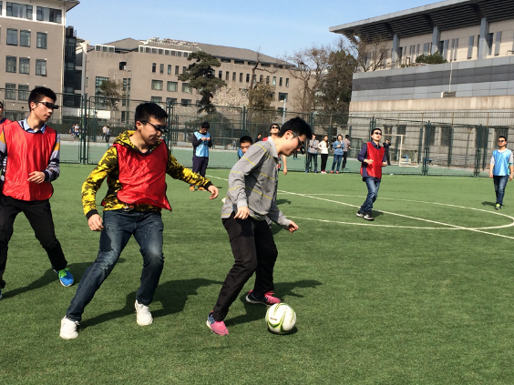 望远镜足球比赛在五四体育场开展。在各组成员的自我介绍和战术讨论后,紧张有趣的比赛正式开始。同学们在头戴式望远镜的干扰下窘态百出,不仅难以控制足球,甚至连跑位都找不着方向,引起了场上场下的阵阵欢笑。参与活动的同学们不仅得到了身体的锻炼,彼此之间也有了更深入的了解。与此同时,“撕名牌”小组活动在静园草坪进行。三个小组的成员们首先进行了短暂的热身,并且在背后贴上了“名牌”。比赛开始,同学们在保证安全的前提下,采取各种团队策略,相互配合、智取巧夺。最终第三小组连续两轮赢得比赛,成为胜者。