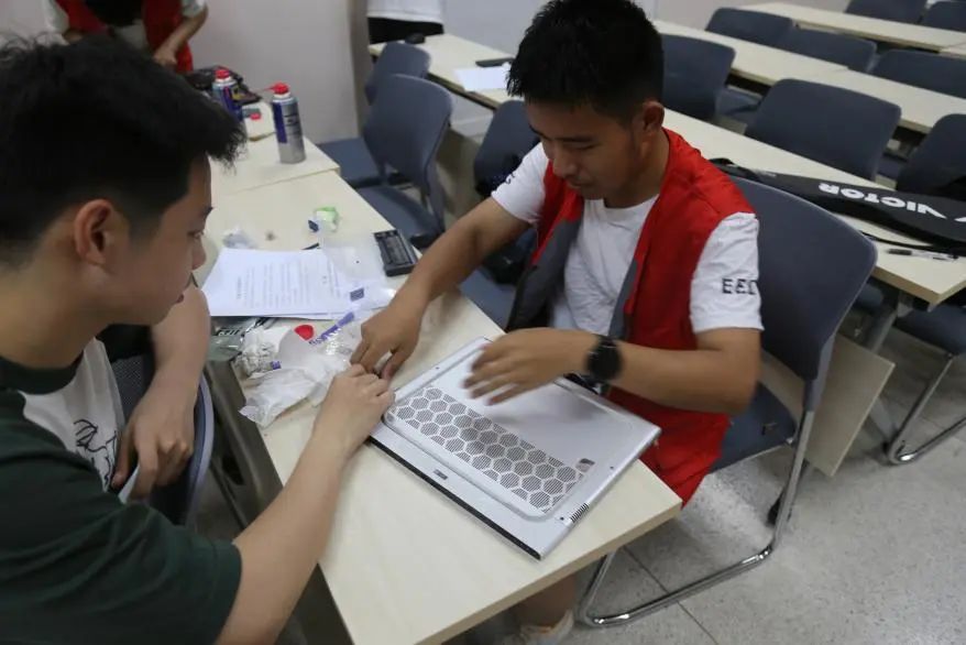 下午2:50讲座结束,本次活动的电脑维修开始了,志愿者们领取维修物资:螺丝刀、翘片、收纳盒、酒精棉片等。大家各自接单,耐心解决客户的清灰、换硅脂、清理内存等电脑问题。志愿者们也都互相帮助,热心解答客户们提出的一些有关电脑基础知识和电脑故障的问题,让参加活动的同学电脑知识都有所提高。维修中志愿者们遇到了一些难以处理的问题,大家通过现场学习、细心琢磨把它们逐一攻克。活动后,同学们都对此次服务表示满意。