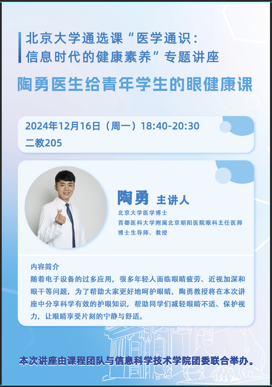 陆俊林教授和北医三院薄世宁主任医生联合开设,讲授医学和科技对现代生活的影响。每学期的课程中会邀请知名专家安排一两次专题讲座。本次迎来了一位重量级嘉宾——眼科医生陶勇教授,他将为大家开设专题讲座“给青年学生的眼健康课”。讲座聚焦现代青年学生在信息时代普遍面临的眼健康问题,让同学们了解和掌握眼健康相关的科学原理和科研前沿进展,同时帮助同学们科学护眼、改善用眼习惯。